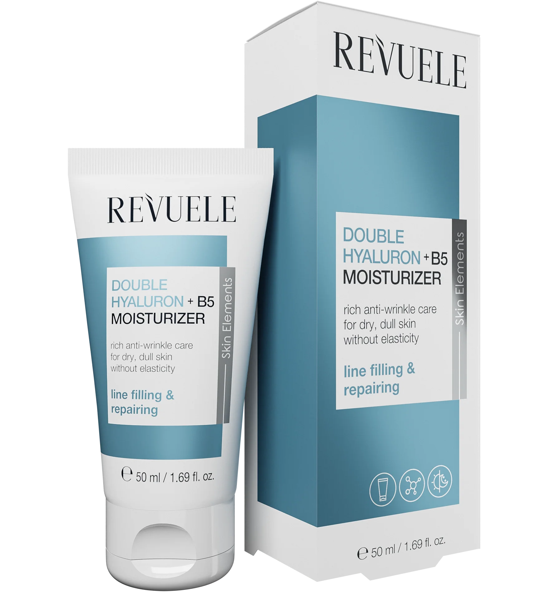 REVUELE DOUBLE HYALURON + B5 MOISTURIZER is a rich face and neck cream with a delicate, ultra-hydrating texture. It combines two types of Hyaluronic Acid – one with higher and one with lower molecular weight that are able to penetrate different layers of the skin and thus hydrate it more effectively. They work simultaneously to instantly fill fine lines, making skin smoother & softer, and to provide deeper, long-lasting moisturization. Infused with calming and repairing Provitamin B5, this moisturizer promotes visibly revitalized, healthier-looking skin. Used regularly, it contributes to less noticeable wrinkles as well as enhanced elasticity and tautness. It contains: Water / Aqua, Glycerin, Provitamin B5 / Panthenol, Propylene Glycol, Shea Butter / Butyrospermum Parkii Butter, Cetearyl Alcohol, Caprylic/Capric Triglyceride, Glyceryl Stearate, Ceteareth-20, Ceteareth-12, Cetyl Palmitate, Macadamia Ternifolia Seed Oil, Centella Asiatica Leaf Extract, Betaine, Inulin, Alpha-Glucan Oligosaccharide, Palmitoyl Tripeptide-5, Xanthan Gum, Caprylyl Glycol, Hydrolyzed Wheat Protein, Hydrolyzed Soy Protein, Pectin, Arginine, Proline, Serine, Butylene Glycol, Glucose, Carrageenan, Dimethicone, Phenoxyethanol, Sodium Hyaluronate, Hydrolyzed Hyaluronic Acid, Allantoin, Acrylates/C10-30 Alkyl Acrylate Crosspolymer, Triethanolamine, Fragrance / Parfum, Vitamin E Acetate / Tocopheryl Acetate, Ethylhexylglycerin, Сitric Acid, Disodium EDTA, Sodium Benzoate, Potassium Sorbate.