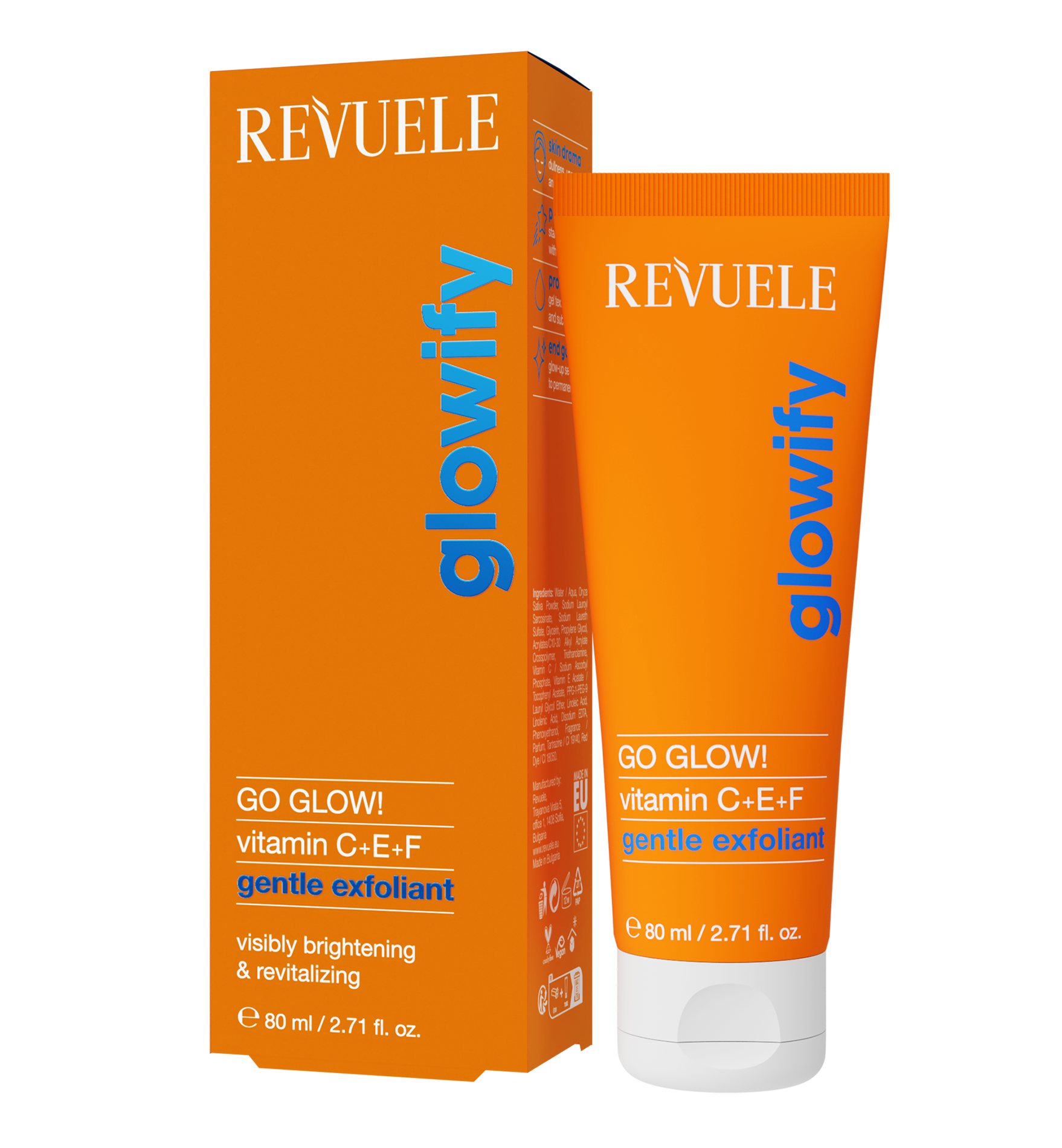 REVUELE Go Glow! Gentle Exfoliant Vitamin C+E+F, 80 ml – brighten and smooth your skin with a burst of antioxidants! This gentle exfoliant removes dullness, evens tone, and boosts radiance for a fresh, glowing complexion. Reveal your natural glow every day!